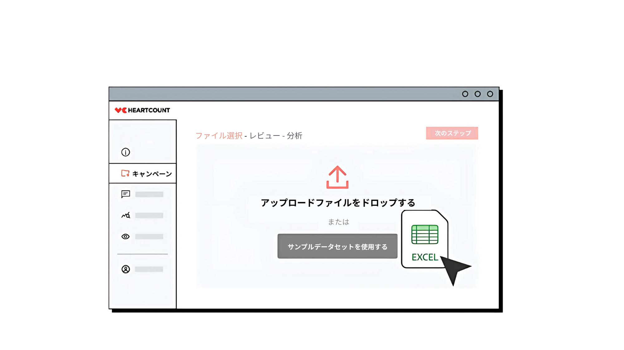 HEARTCOUNTは、複雑なデータ分析のために特別な知識を必要としません。普段使っている.xlsxや.csvファイルをドラッグ&ドロップでアップロードするだけで、AIが自動的にデータの特徴を把握し、最適な形式で素早く可視化します。