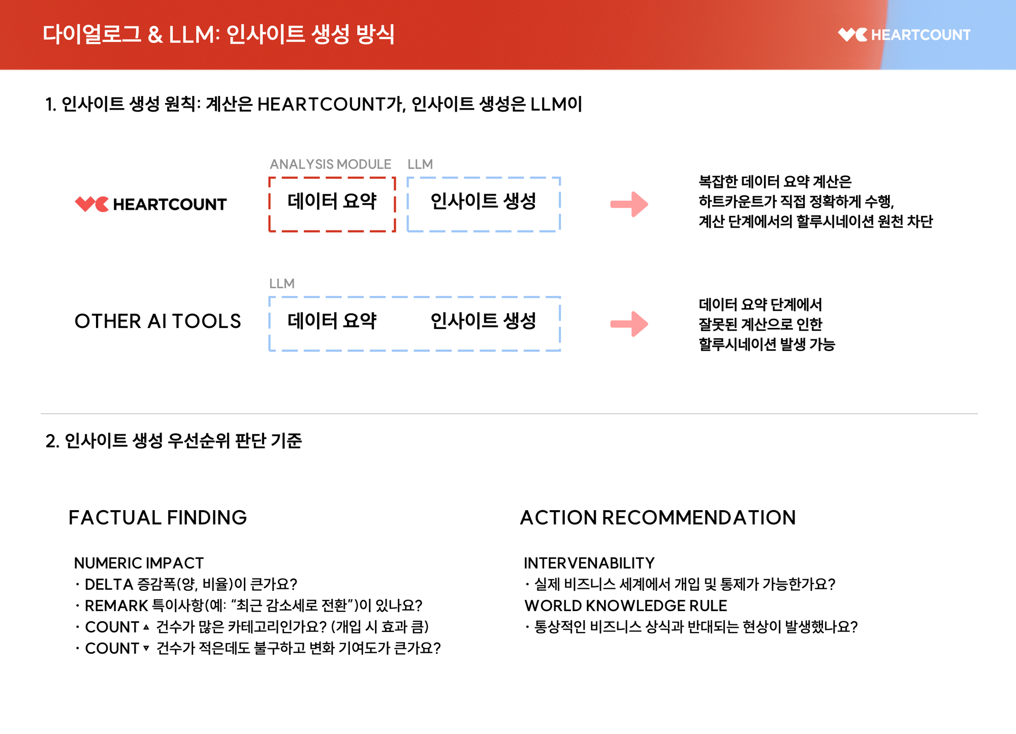 HEARTCOUNT의 LLM 기반 인사이트 생성 기술은, 계산의 정확성을 보장하면서 실제 비즈니스 현장에서 활용할 수 있는 차별화된 문장을 생성하기 위해 다양한 장치를 적용하고 있습니다.