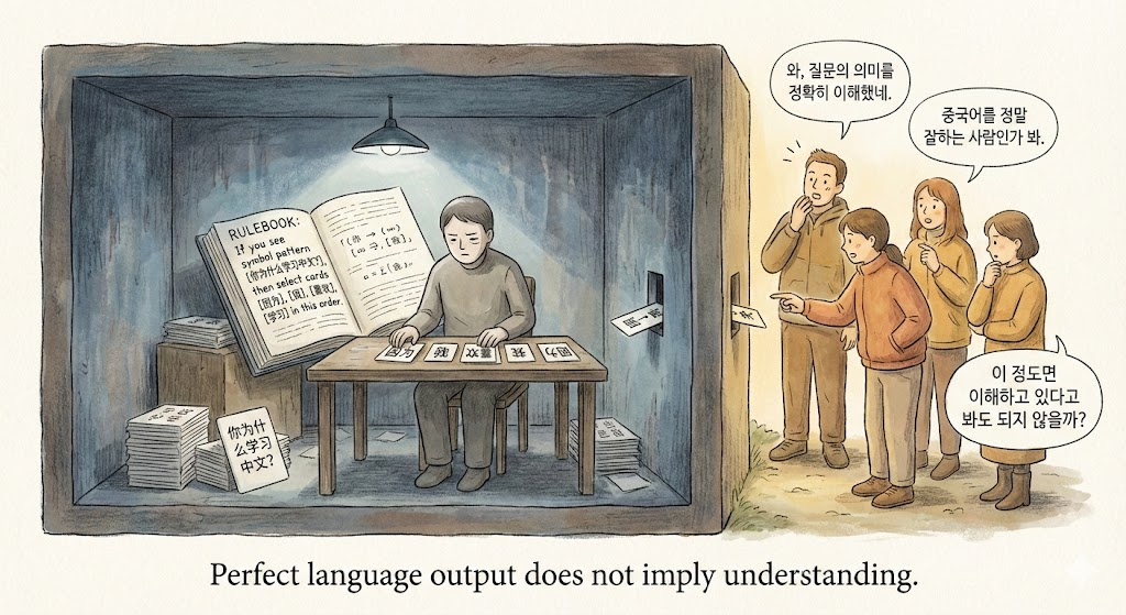 이 지점에서 자연스럽게 떠오르는 고전적인 사고실험이 있습니다. 바로 철학자 존 설(John Searle)의 중국어 방(Chinese Room) 논증입니다. 워낙 유명한 실험이지만, 지금 우리가 이야기하고 있는 LLM과 세계 이해의 문제를 다시 비춰보기에 이만큼 적확한 비유도 드뭅니다.