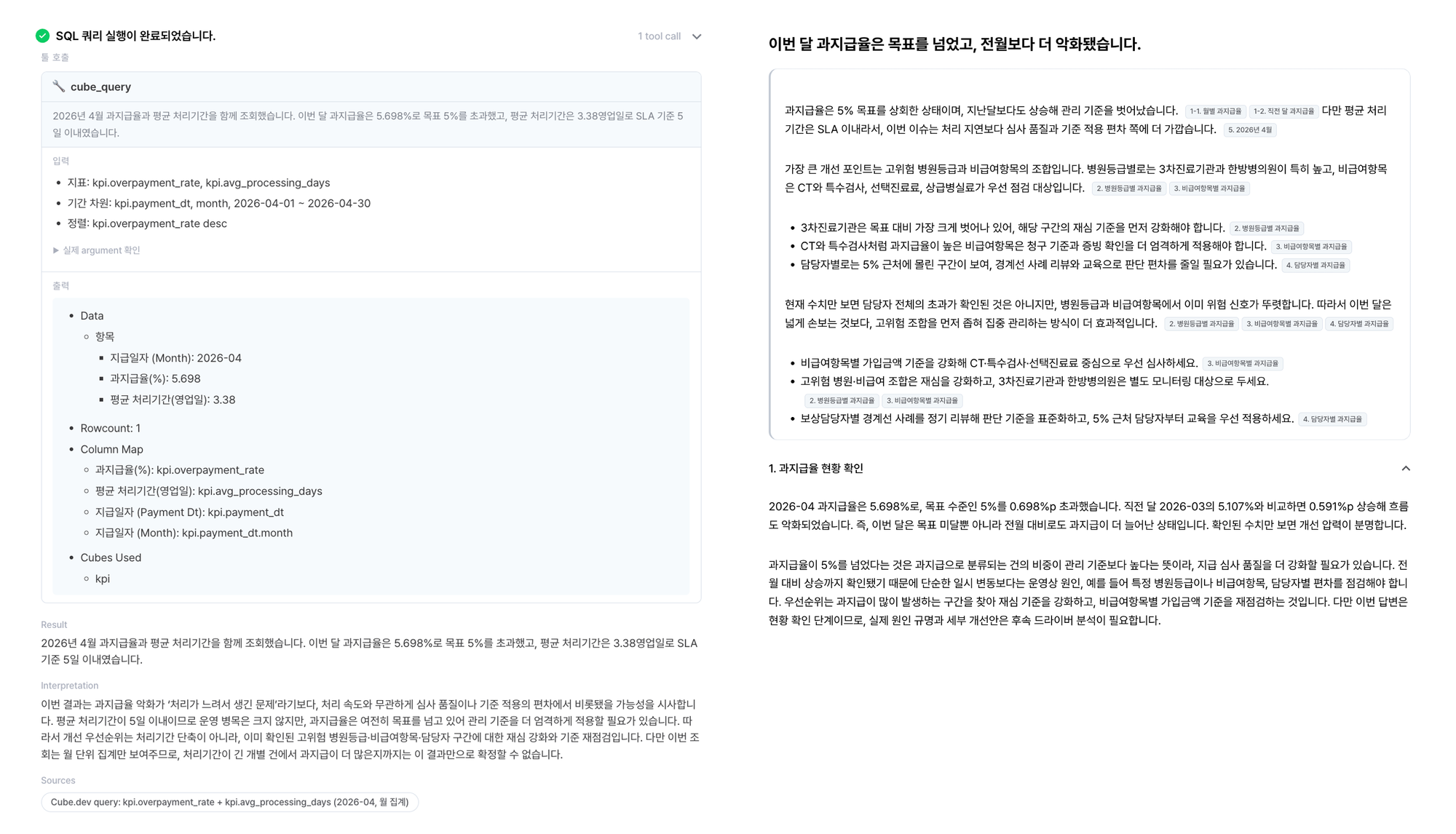 "이번 달 과지급율이 어떻게 됐어?"라는 질문에 5.7%를 반환하는 데서 그치지 않습니다. 목표 초과 여부, 전월 대비 추세, 처리 지연보다 심사 품질 문제일 가능성까지 해석하고, 고위험 병원등급 × 비급여항목처럼 먼저 좁혀야 할 구간을 구체적으로 짚어줍니다.
