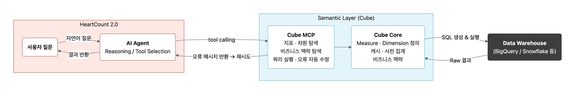 벤치마크를 통해 Semantic Layer가 AI Agent에 더 나은 데이터 인터페이스라는 점을 확인했습니다. HEARTCOUNT 2.0은 그 위에서 실제 비즈니스 분석 워크플로를 구현하려는 다음 단계의 시도입니다. 데이터 팀의 역할이 쿼리 작성에서 지표 정의와 분석 경로 설계로 이동하는 변화의 시작점이라고 생각합니다.