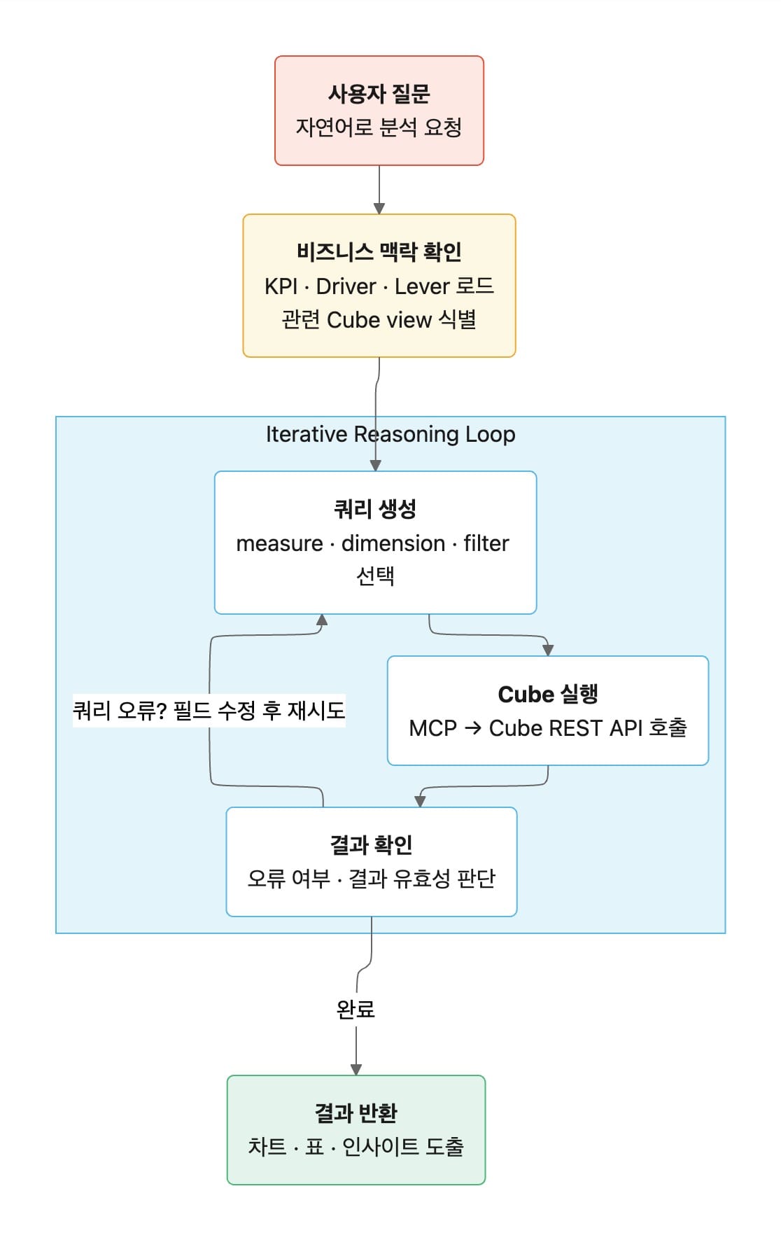 다른 하나는 Cube MCP(Model Context Protocol)를 통한 쿼리 실행 루프입니다. 쿼리가 실패하면 MCP는 오류 메시지를 에이전트에 돌려주고, 에이전트는 잘못된 필드나 조건을 수정해 다시 시도합니다. 사람이 개입하지 않아도 스스로 보정하는 구조입니다.