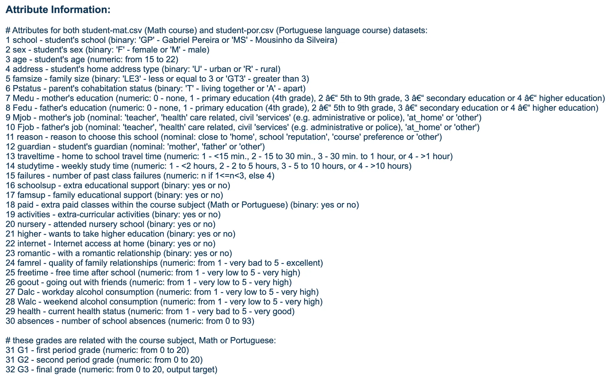 This data approach student achievement in secondary education of two Portuguese schools. The data attributes include student grades, demographic, social and school related features) and it was collected by using school reports and questionnaires. Two datasets are provided regarding the performance in two distinct subjects: Mathematics (mat) and Portuguese language (por). In [Cortez and Silva, 2008], the two datasets were modeled under binary/five-level classification and regression tasks. Important note: the target attribute G3 has a strong correlation with attributes G2 and G1. This occurs because G3 is the final year grade (issued at the 3rd period), while G1 and G2 correspond to the 1st and 2nd period grades. It is more difficult to predict G3 without G2 and G1, but such prediction is much more useful (see paper source for more details).