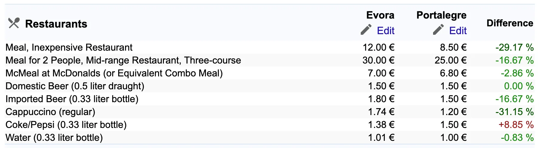 • Evora와 Portalegre 각각 도시의 특성이 존재할까? 어떤 도시가 상대적으로 ‘더 잘 사는’ 도시일까? (데이터 분석 데이터 내에 존재하는 팩트 뿐 아니라, 데이터를 둘러싼 정황을 아는 것 또한 중요한 일이 된다). Numbeo라는 사이트에서는 도시 수준의 생계비(Cost of Living) 지표를 제공한다. 평균적으로는 Evora가 ‘더 잘 사는’ 도시인 듯 보인다(물론 학생 개개인의 가정 별 편차가 분명히 존재하기는 하겠지만 말이다).