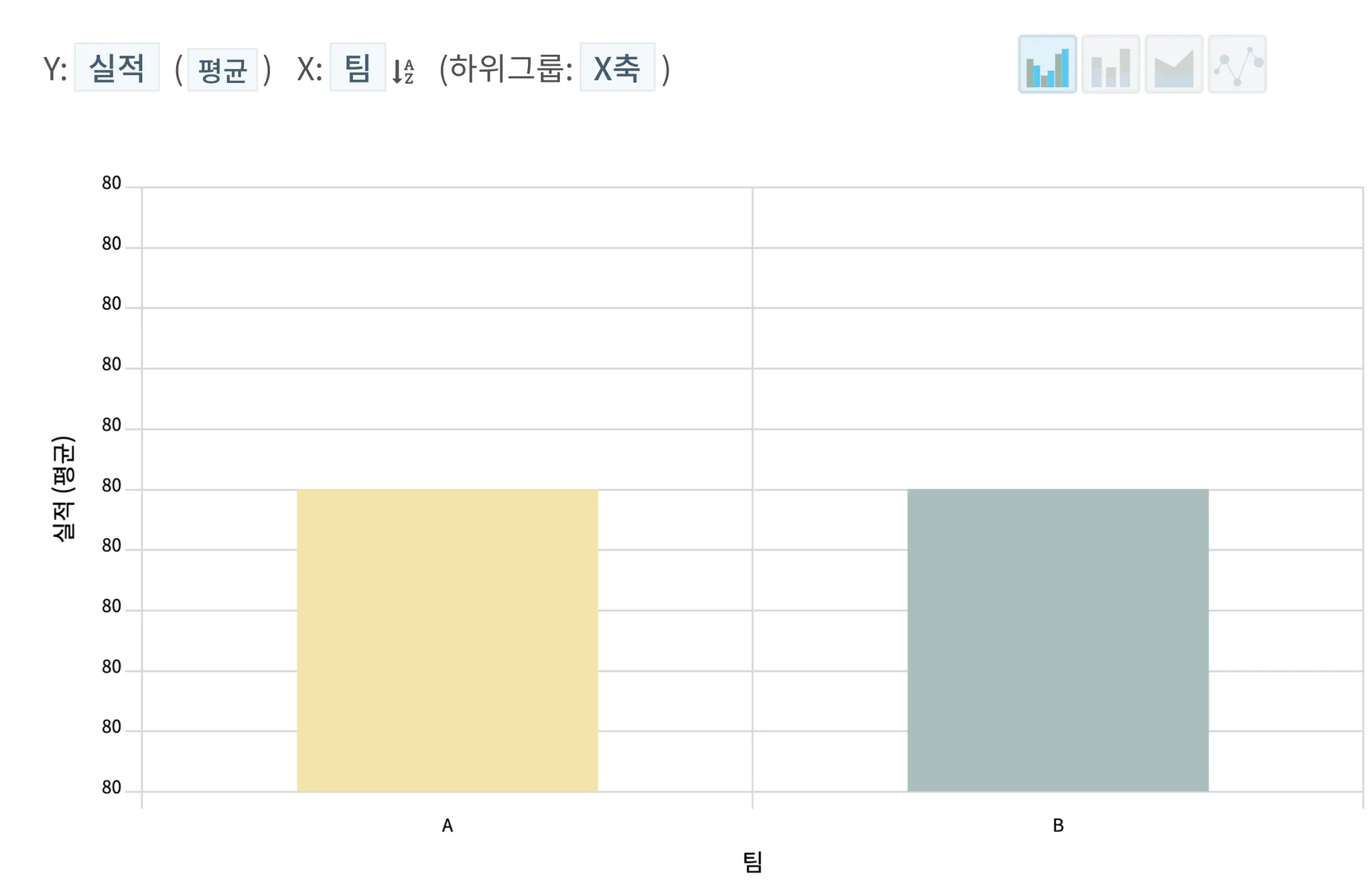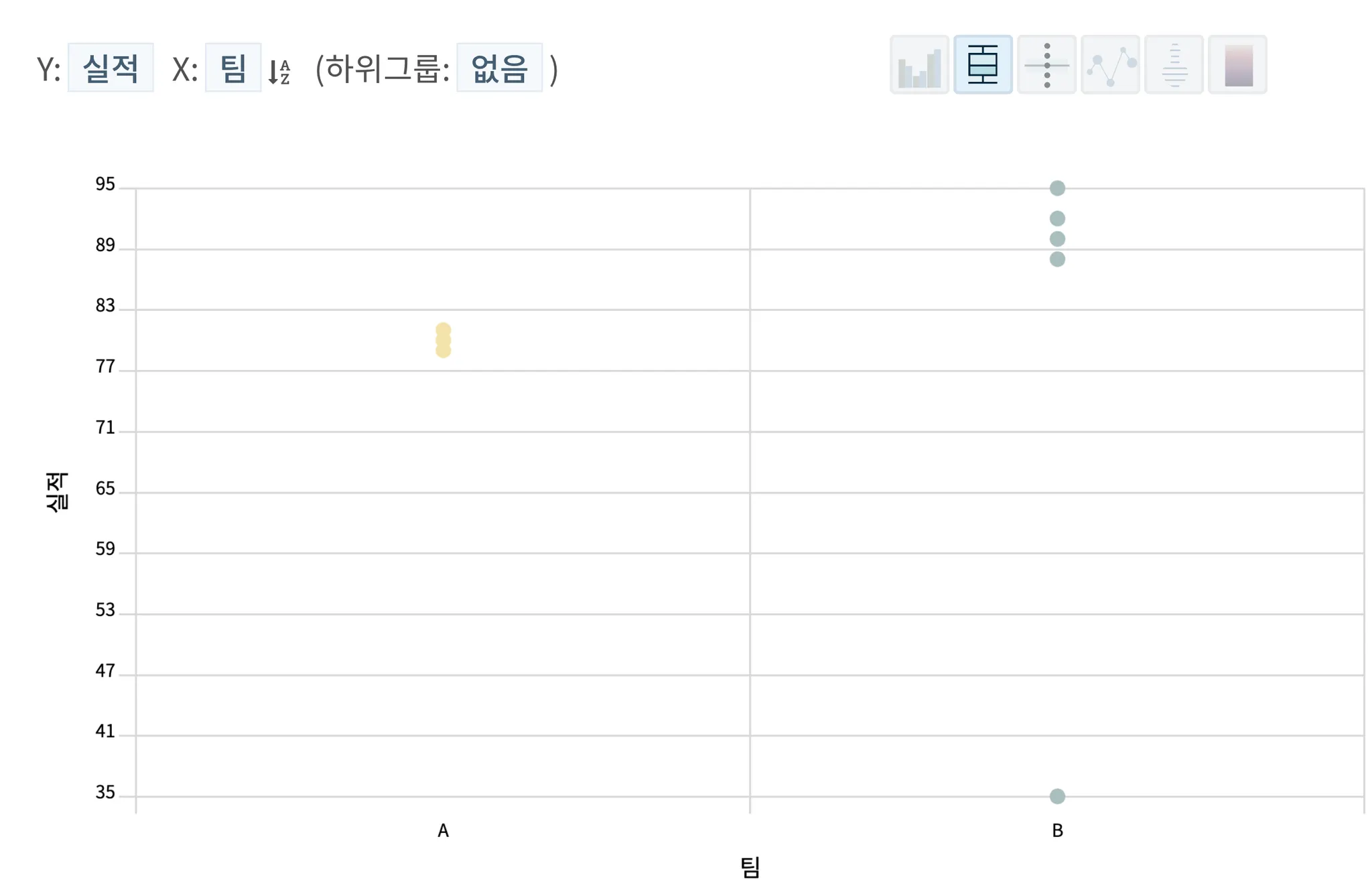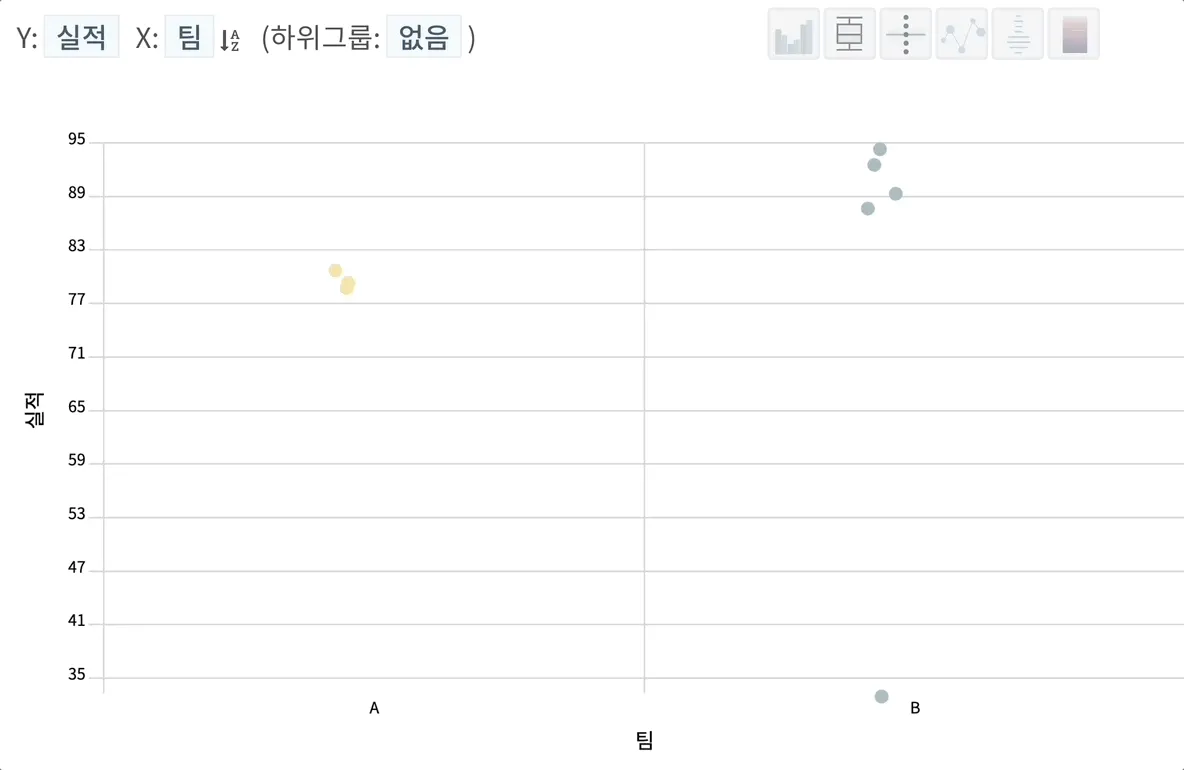 바 차트. 평균이 동일하니 각 팀의 실적 바의 높이도 동일하고 이런 경우 두 팀이 유사하다는 결론을 내리기 쉽다. 하지만 각 개별 데이터를 살펴보면 어떨까? HEARTCOUNT에서는 각 개별 레코드(행)을 각각의 점으로 나타내는 산점도를 빠르게 그려볼 수 있다.