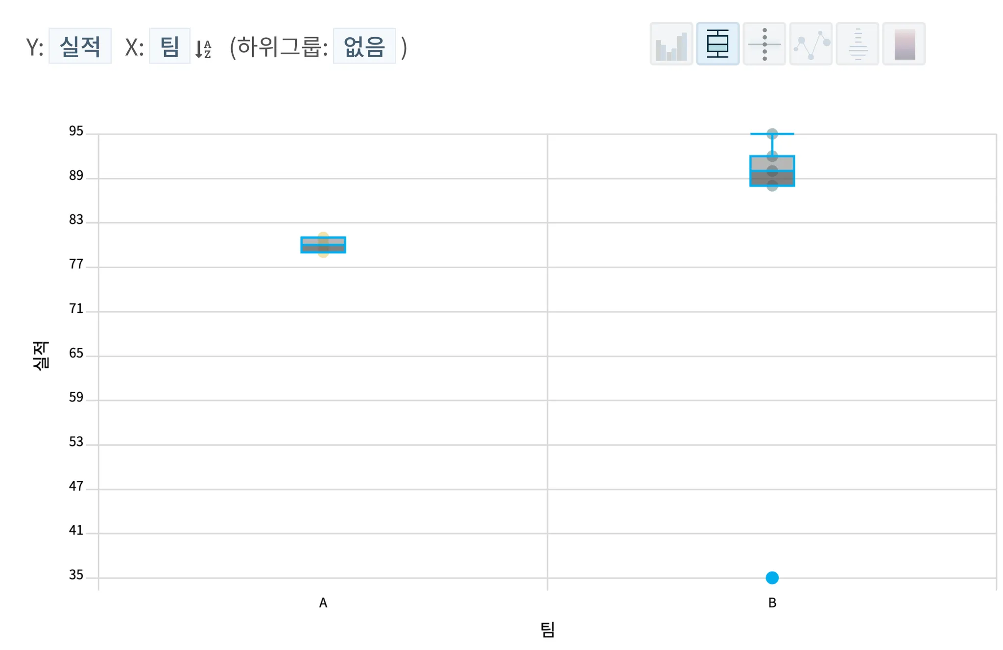 또한, HEARTCOUNT의 스마트 플롯에서는 박스플롯을 활용해 분포를 확인할 수 있다. 그리고 각 박스를 클릭하면 각 팀 A,B의 통계 정보를 확인할 수 있다. 두 팀은 평균은 같아도 중앙값(각 팀 직원들을 실적 점수별로 줄을 세웠을 때 중간에 위치한 직원의 점수)에는 분명한 차이가 존재한다.