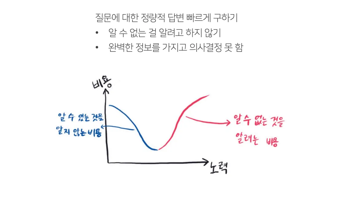 - 그렇기 때문에 데이터 분석을 진행할 때에는 데이터셋에서 알 수 있는 것과 알 수 없는 것(한계)를 먼저 인식하는 것이 중요합니다. 이렇게 어떤 질문에 답할 수 있는지를 파악하고 그에 맞는 적절한 분석 방법과 시각화 기법을 선택하면 됩니다. 이를 통해 데이터 분석 또는 보고 과정에서 노력을 최소화하는 지점을 찾을 수 있습니다.