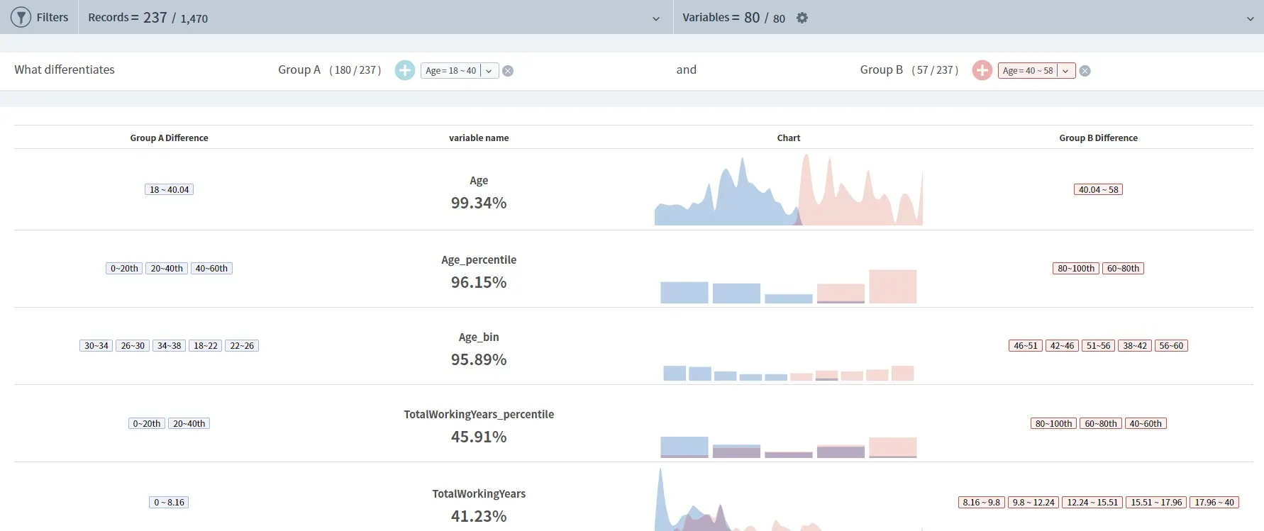 - 또한 부서별 현황을 봤을 때 영업직과 연구개발직에 이탈자가 몰려 있음을 알 수 있음.