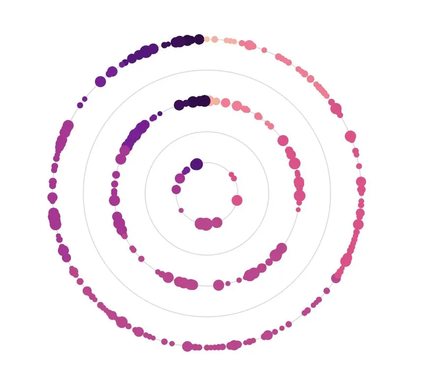 색상은 BMI수치로 농도를 구분했고, 12시방향에서 시계방향으로 BMI의 수치가 높아질수록 농도가 짙어진다. 아울러 혈당수치를 기준으로 원 크기를 구분했기때문에 혈당과 BMI 수치가 안 좋은 케이스와 질병의 발병현황을 직관적으로 알 수 있다.