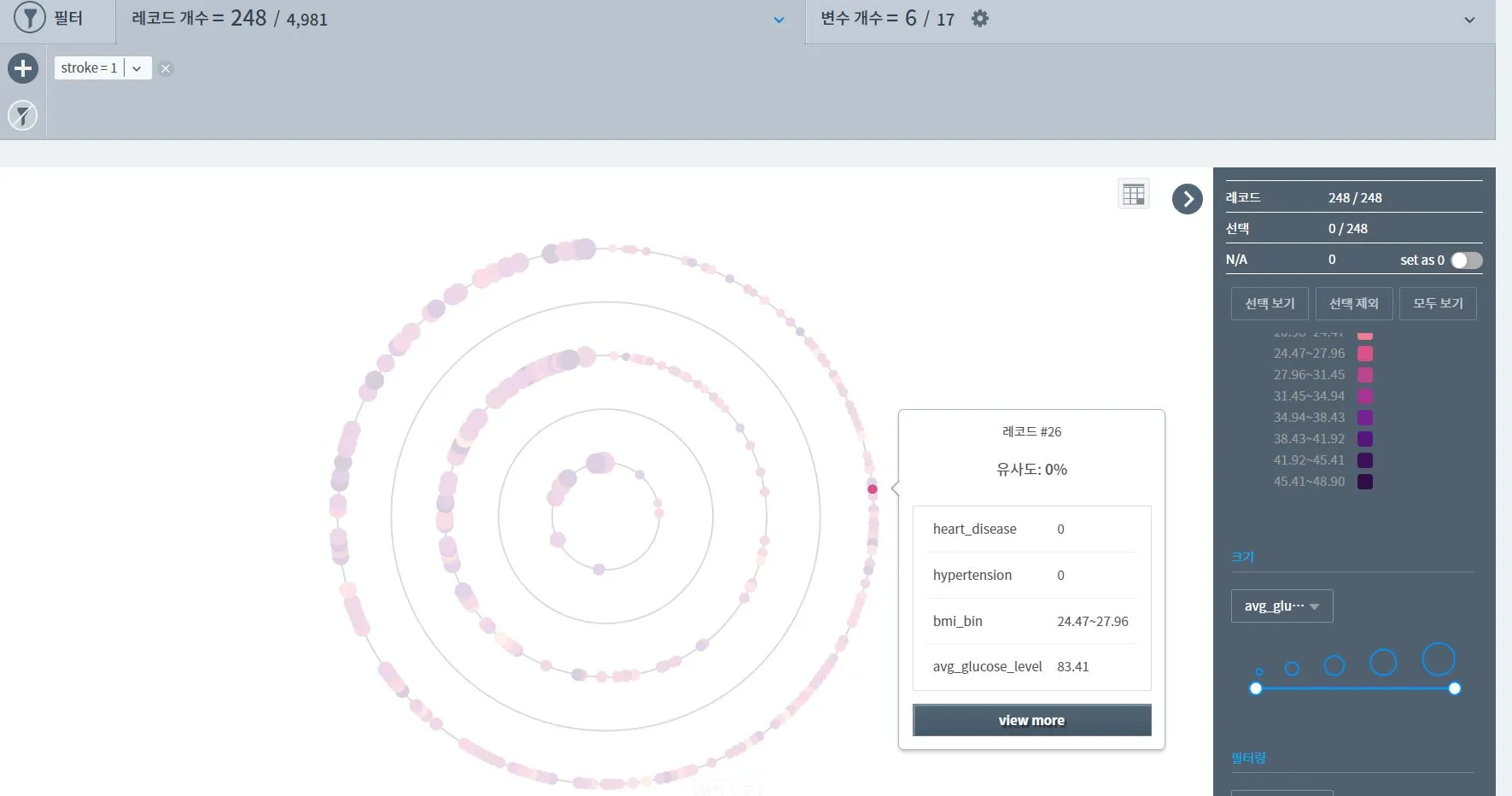데이터에서 나온 여러가지 조건(결혼유무, 거주지역, 직업군 등)들과 뇌졸중과의 강력한 연관관계는 찾기 힘들었다. 앞서 말했듯 뇌졸중 환자들의 수치가 많지 않기 때문이고, 실제 연관성이 작을 수도 있다. 가장 강력한 연관성을 보이는 BMI지수와 혈당지수와의 연관성을 잘 보이게 할 수 있는 시각화 방법을 이것저것 찾던중 스마트 서치에서 클러스터 기능을 활용해서 표현해보았다.