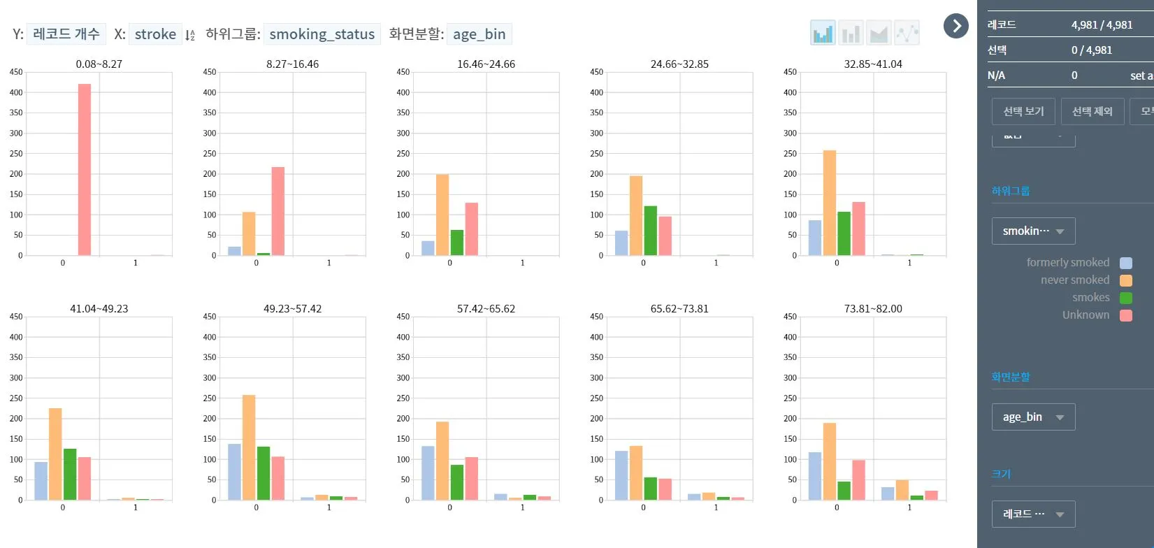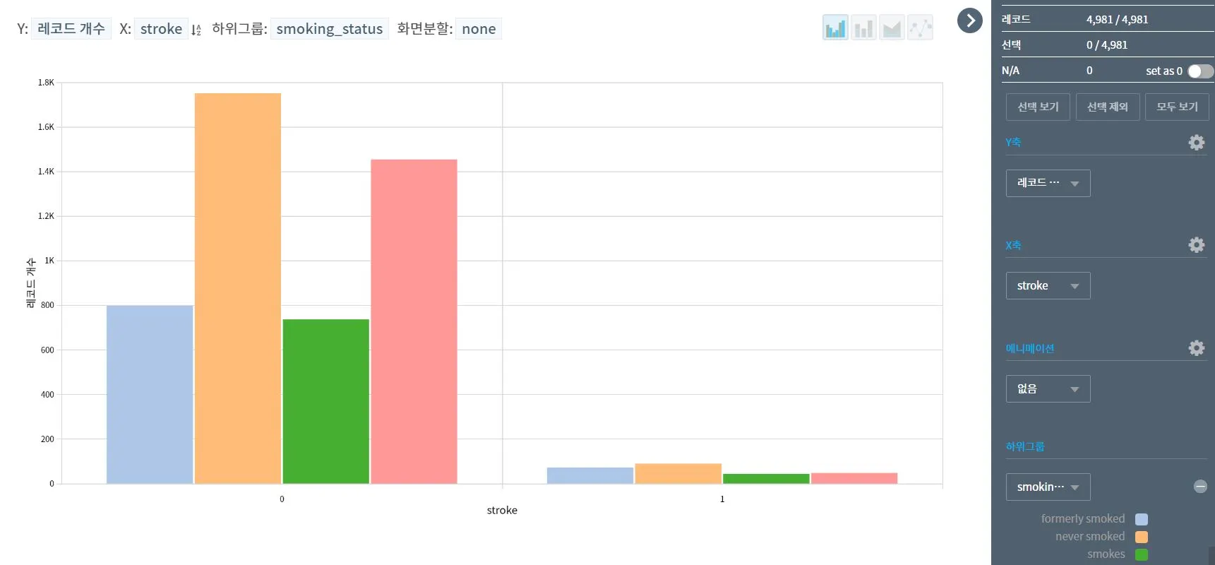 스마트플롯을 활용한 1차 분석결과, 흡연결과와 발병현황의 연계가 뚜렷하게 나타나지 않아 당황스러웠다. 뇌졸중에 걸린 사람 중 규칙적으로 흡연하는 사람은 70명, 담배를 피지 않는 사람은 89명이다.