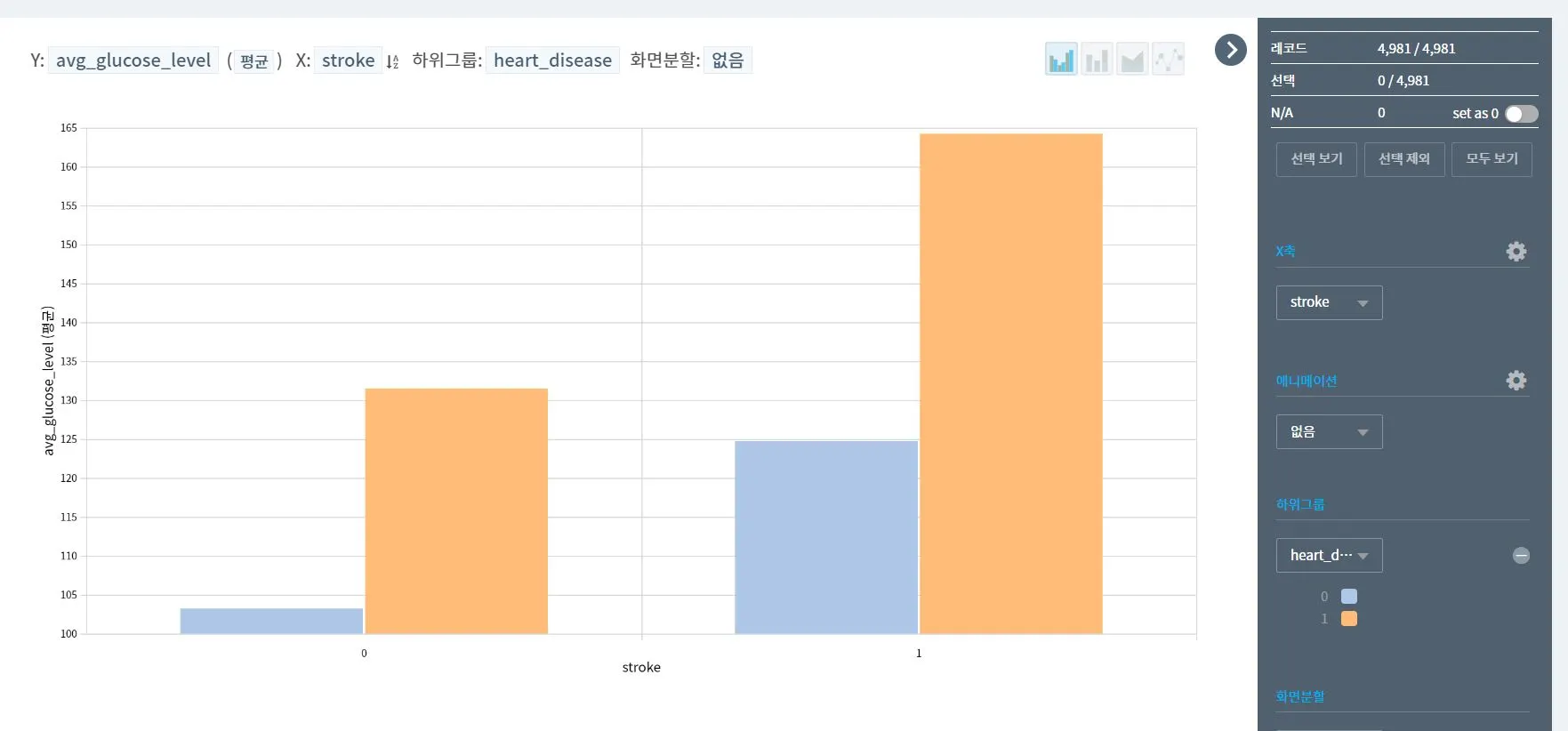 하기의 분석자료는 혈당수치를 Y축으로 하여, 뇌졸중 발병자와 심장질환 발병자를 함께 분석한 자료이며, 뇌졸중 질환자 (오른쪽 분할화면) 중 심장질환도 발병한 사람은 17% 정도이다.(안타까운 상황이다.)