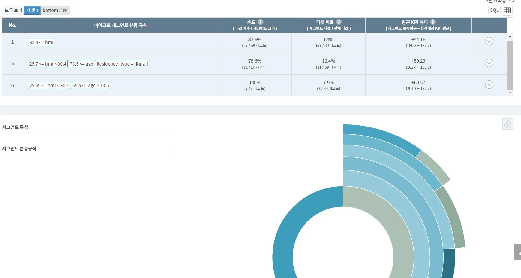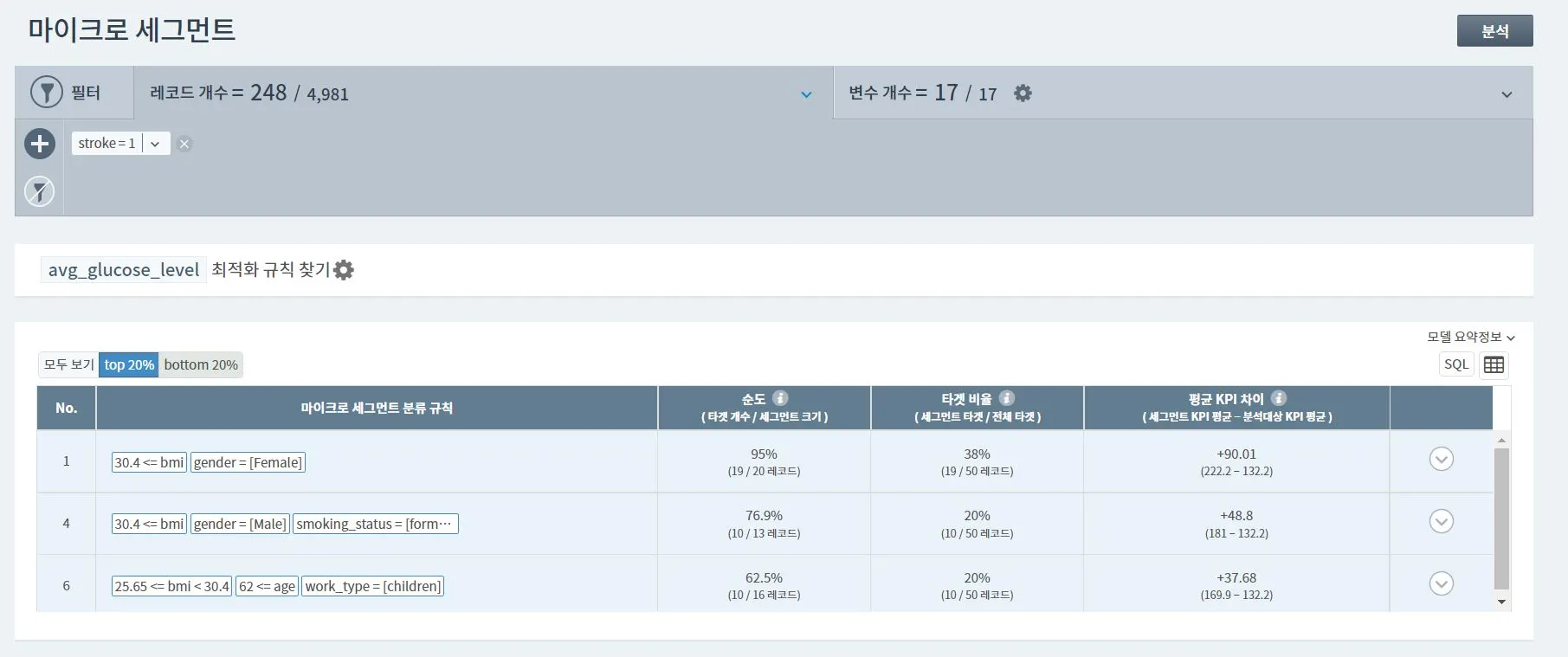 이에 뇌졸중 발병자 중 높은 혈당 수치를 보이는 사람들을 분석하기 위해 마이크로 세그먼트 기능을 활용했다. BMI지수 30.4이상, 여성의 경우가 높은 관련성을 보이는 것으로 분석된다.