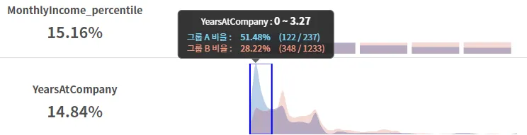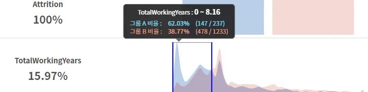 • 1) 총 경력: 총 경력이 0~8.16년 사이의 인원들의 퇴직이 많았습니다.