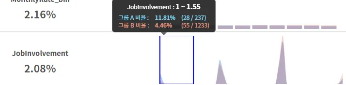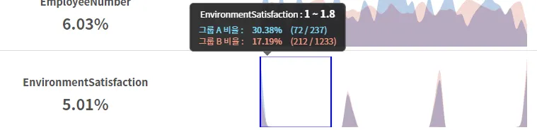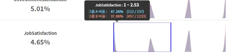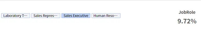 • 초과근무 여부를 제외하고 해당 인원들을 확인해본 결과, 해당 직무는 Sales Representative, Human Resources, Laboratory technician, Research scientist 이었습니다. 이에 해당 직무에서 근무하는 인원들을 중점적으로 모니터링해볼 필요가 있을 것 같습니다.