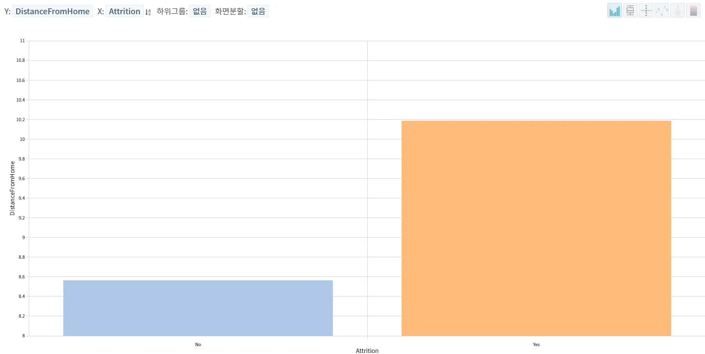 • 또한 해당 직무 중 퇴직한 직원의 직장과 집의 거리를 확인해보니 평균 거리는 10.18이었습니다. 이직하지 않은 인원의 평균 거리가 8.56이다보니, 직장과 집의 거리가 멀면 멀수록 퇴사할 가능성이 높아지는 것을 예측해볼 수 있습니다.