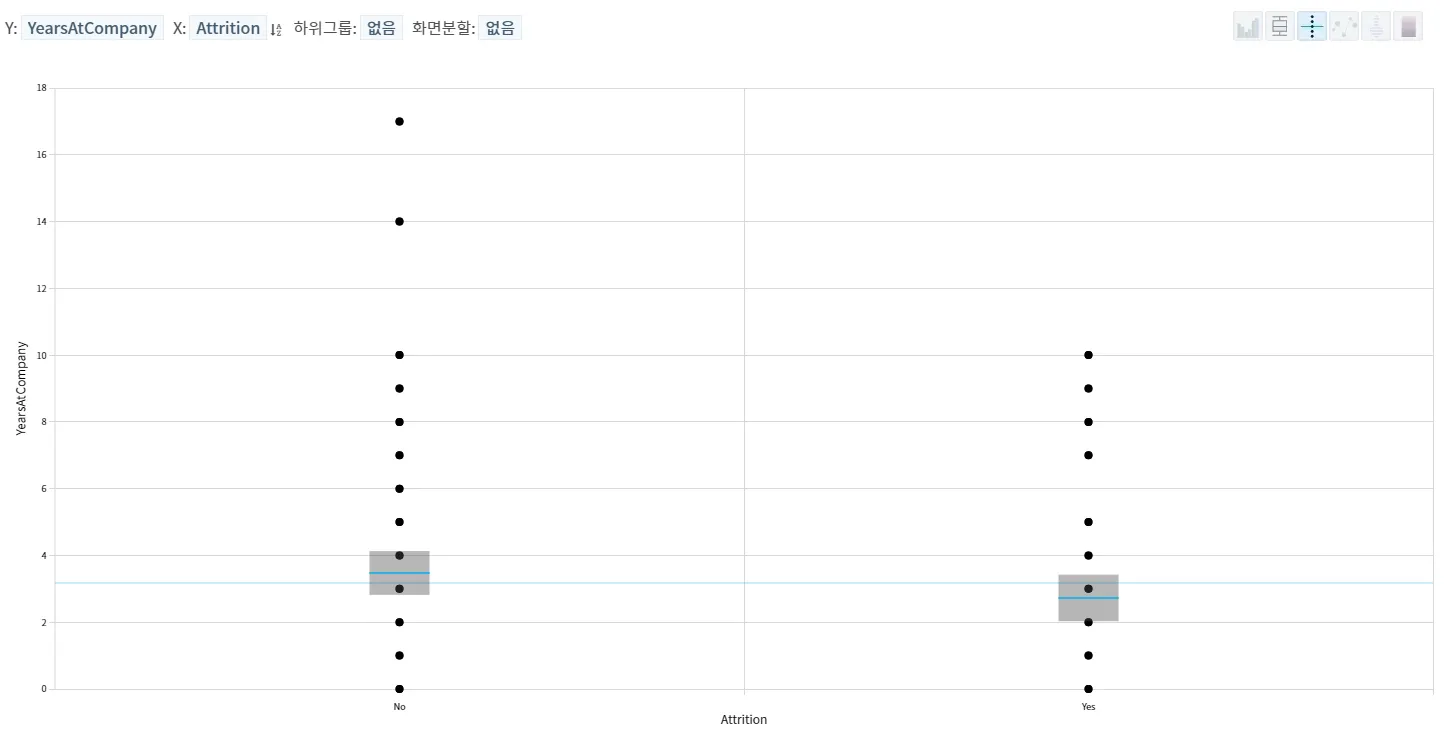• 퇴직자(2.73)와 재직자(3.48)의 평균 근속 년수가 차이는 미미했지만, 퇴직자 근속 년수의 신뢰구간은 2.03 ~ 3.43이므로 입사 후 2년차~3년 경과된 인원에 대한 모니터링이 필요할 것 같습니다.