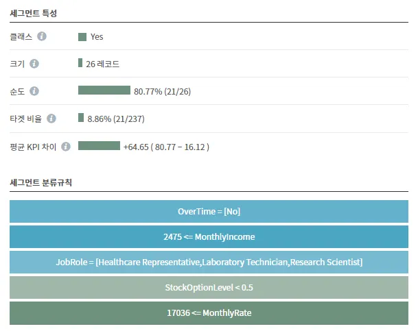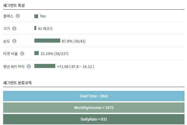 Summary: 월 소득 $2,475 미만, 일 급여 수준 $931 미만 직원의 퇴사 가능성 예측 지표
