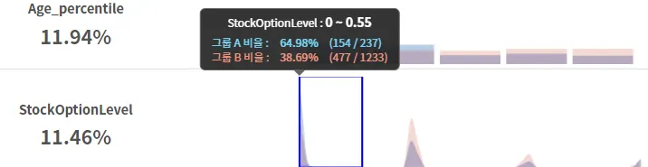 • 2) 스톡옵션 수준: 수준이 0 ~ 0.55 정도인 인원 중에서 퇴사자가 많았습니다.