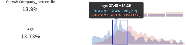 • 3) 나이: 28.43~34.29세 인원들의 퇴직이 많았습니다.